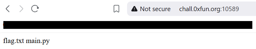 The image above shows the output of the ls command being ran. We can see that there is a text file named flag.txt and a file named main.py. The flag.txt file most likely contains the flag.