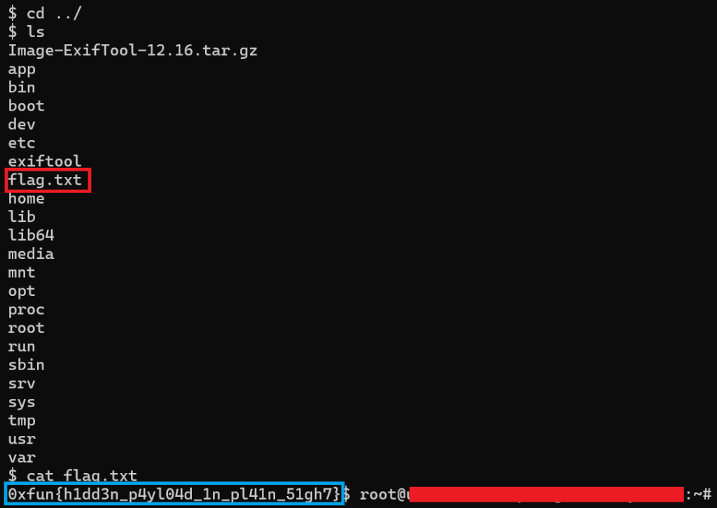 The image above shows the commands I used to find the flag on the web server via the reverse shell. The red box shows the file where the flag is. The blue box shows the actual flag.
